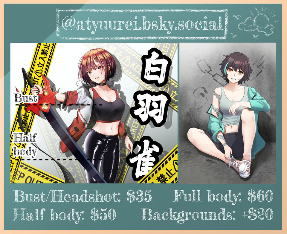 Check the prices and terms below, then message me on Bluesky, Discord (atyuurei), or send me an email!
